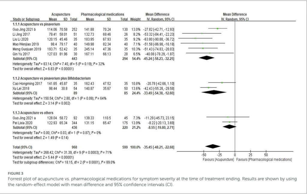 細かい結果を考察すると、全体的な効果として 治療終了時点において、鍼治療は薬物療法と比較して、症状重症度スコアを有意に低下(改善)させていることが読み取れます(平均差 [MD] -35.45)。また治療終了後のフォローアップ期間においても、鍼治療は薬物療法よりも優れた効果を維持していました(MD -23.8)